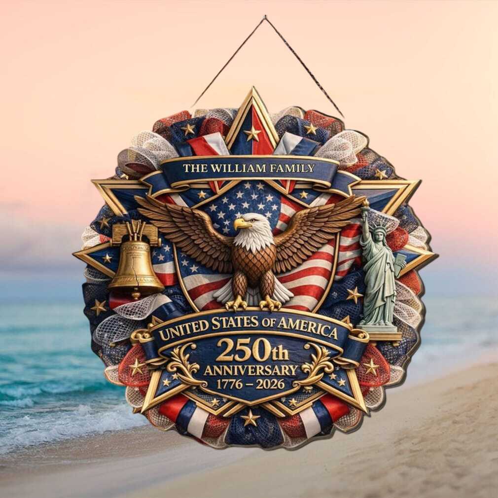 A festive wreath-style ornament sign featuring the Liberty Bell and Statue of Liberty to honor the United States’ 250th anniversary. The decorative wreath frame adds a holiday charm to a patriotic design, making it equally suited for Christmas trees and Independence Day décor.
