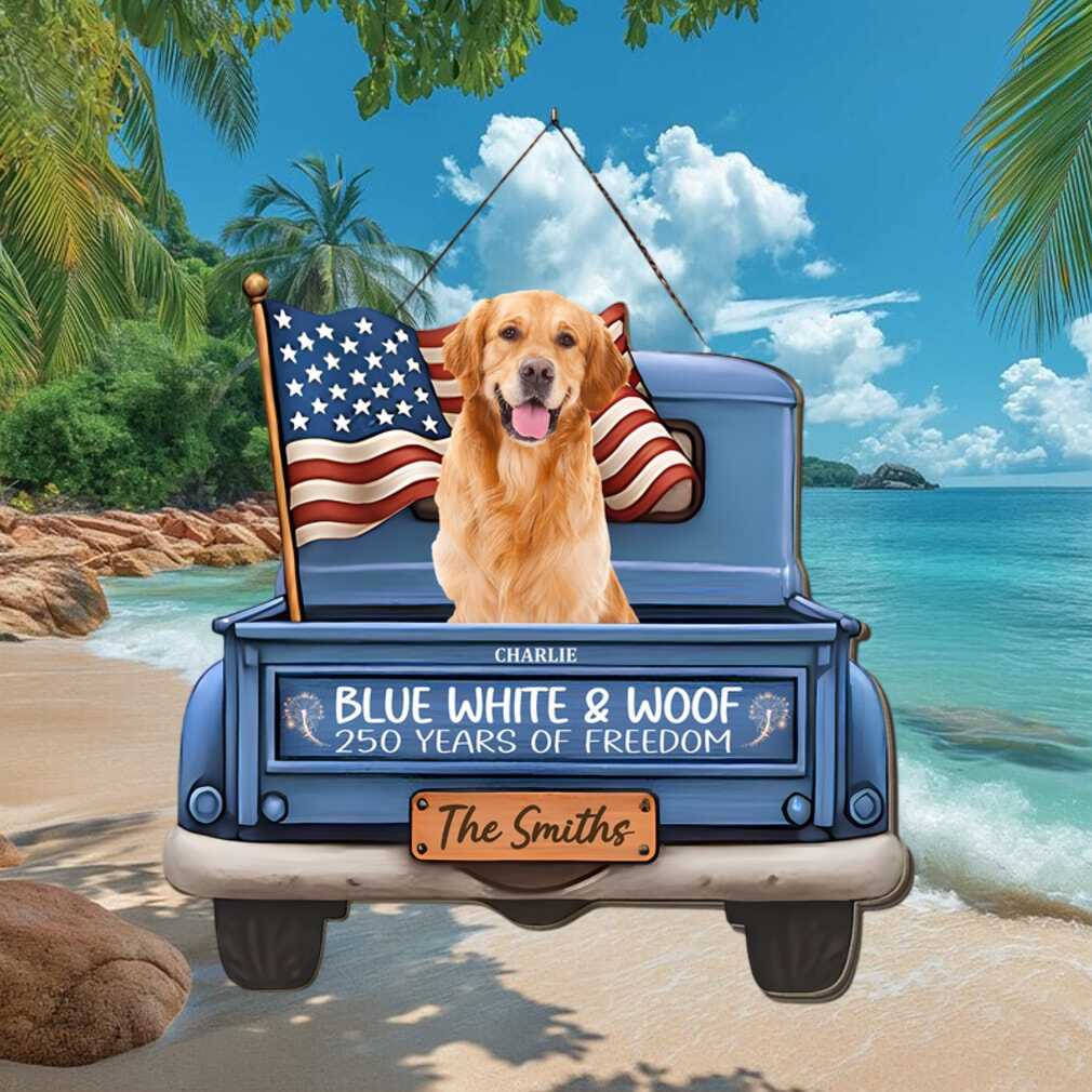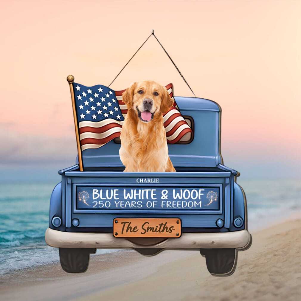 🥤 About Blue White and Woof Personalized Golden Retriever 250 Years of Freedom Truck Ornament