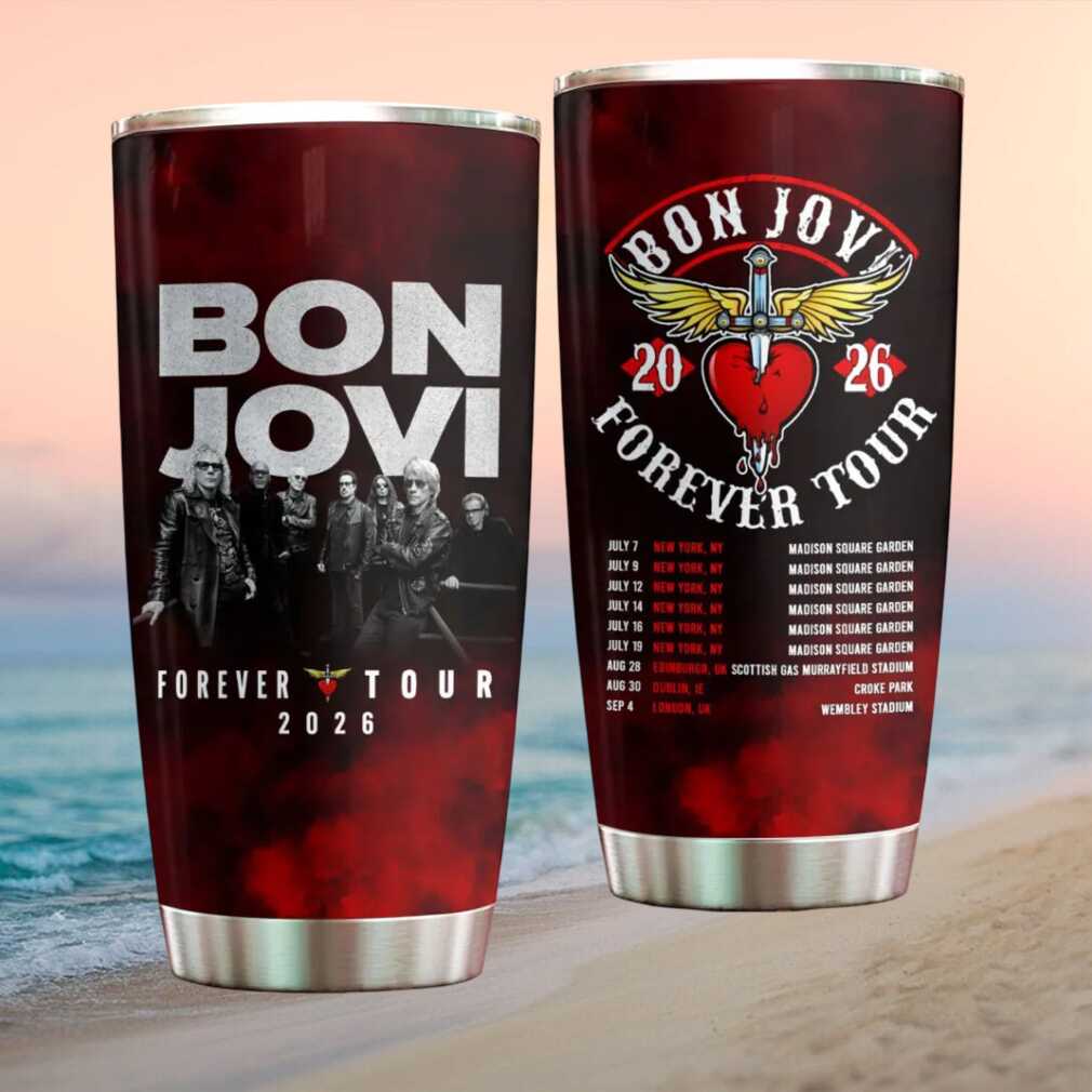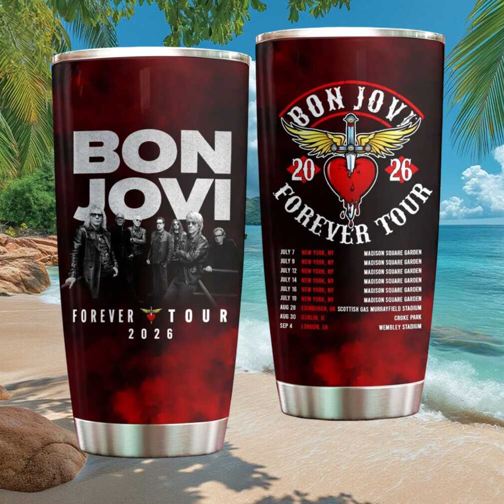 Livin’ on a prayer and on the road with Bon Jovi! This official Forever Tour 2026 tumbler features all concert tour dates, bold rock graphics, and 20oz vacuum insulation. The ultimate tour souvenir for every die-hard Bon Jovi fan.
