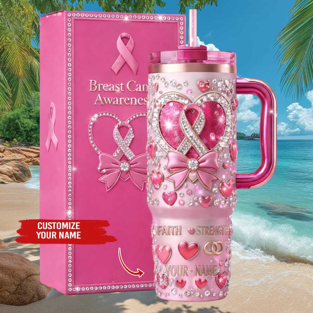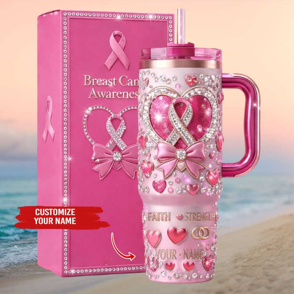 Make it personal with this customizable pink glitter breast cancer awareness tumbler. Add your name or a loved one’s name to this faith- and strength-inspired 40oz stainless steel tumbler. A truly thoughtful and personalized gift for any survivor, fighter, or breast cancer advocate.