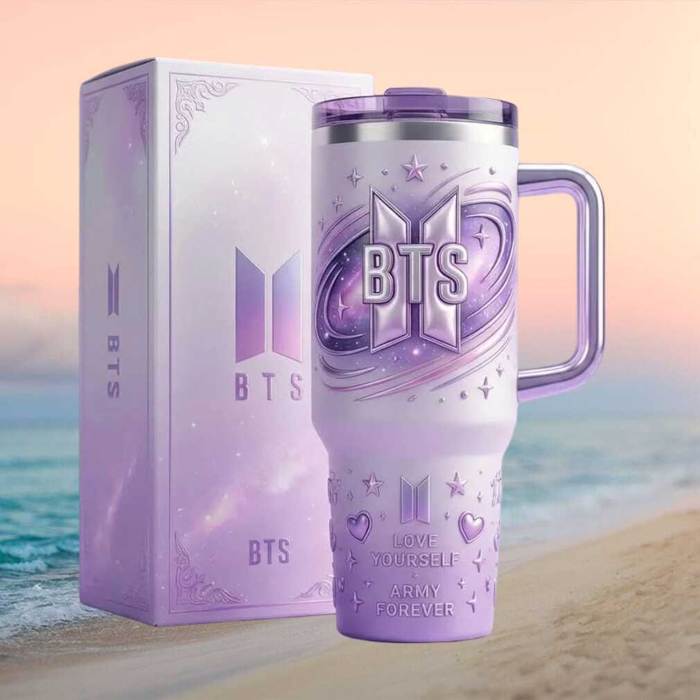 Purple you forever, ARMY! This stunning BTS Love Yourself Galaxy Edition tumbler features a dreamy purple ombré design, celestial artwork, and BTS fan tribute imagery. Complete with a convenient handle for on-the-go use — perfect for every devoted ARMY member.