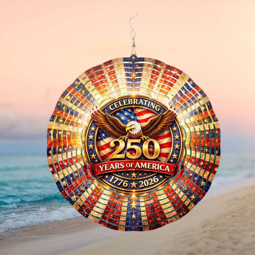 Watch patriotism spin to life with this eye-catching 3D wind spinner ornament marking 250 years of American freedom. The layered design creates a mesmerizing effect as it twirls, displaying 1776–2026 and iconic American imagery. Ideal for outdoor displays, porches, and garden celebrations.