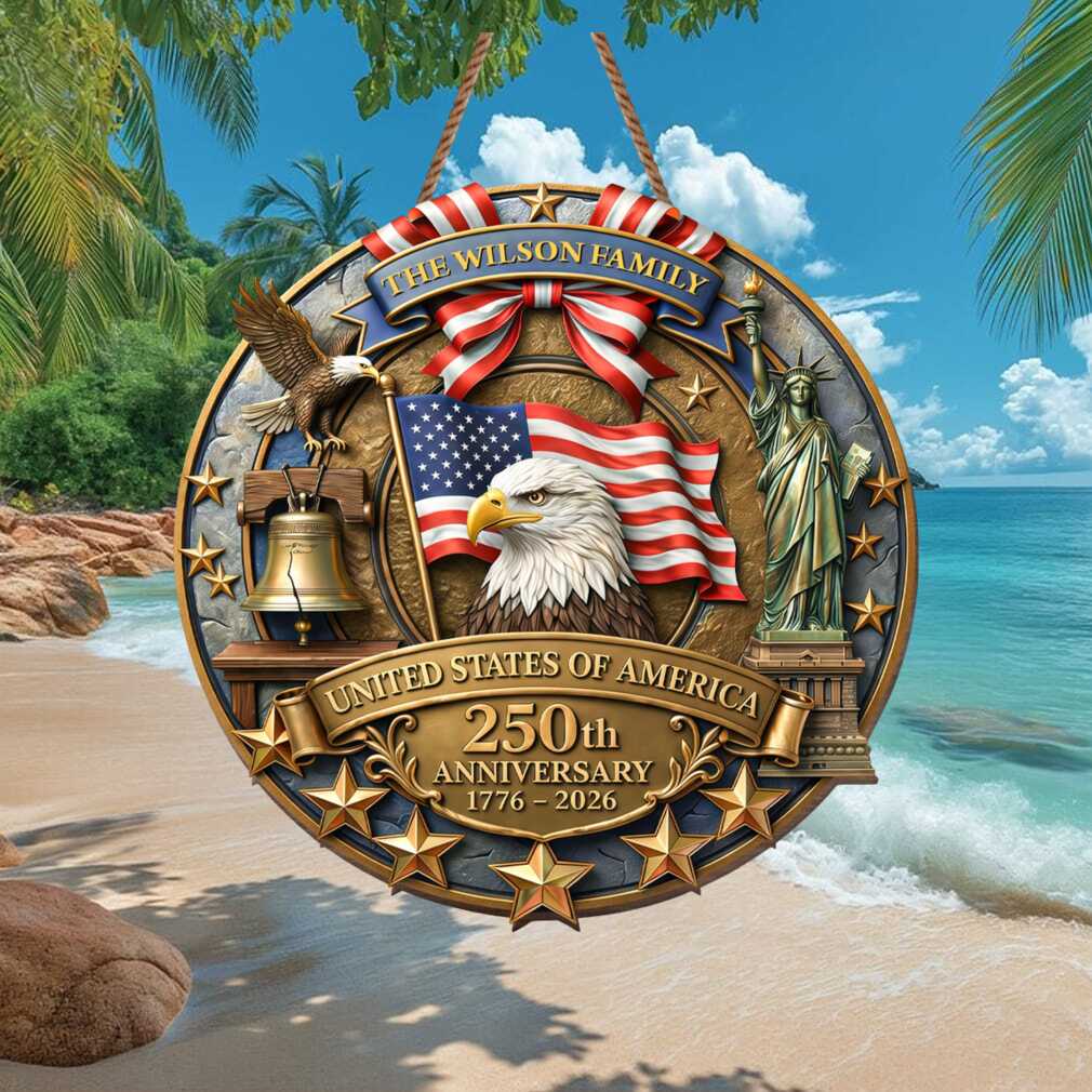 A rustic and refined wooden ornament featuring the Statue of Liberty and marking America’s 250th anniversary. The natural wood material gives this customizable piece a warm, artisan feel that blends patriotic pride with handcrafted aesthetic — ideal for gifting or home display.