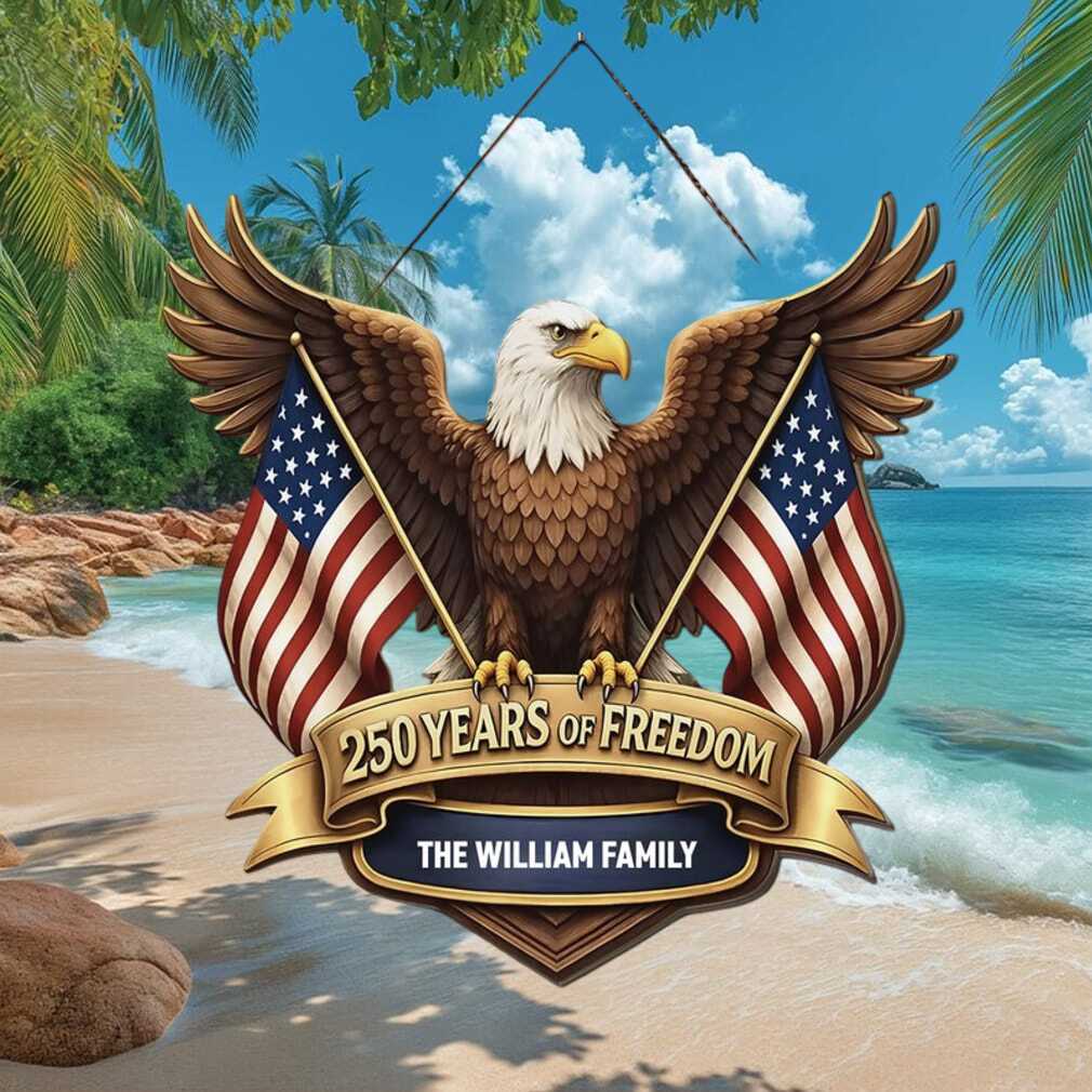 A soaring eagle carries the American flag in this personalized hanging ornament celebrating 250 years of freedom. Your family name is woven into the patriotic design, creating a unique keepsake that honors both your family legacy and America’s semiquincentennial milestone.