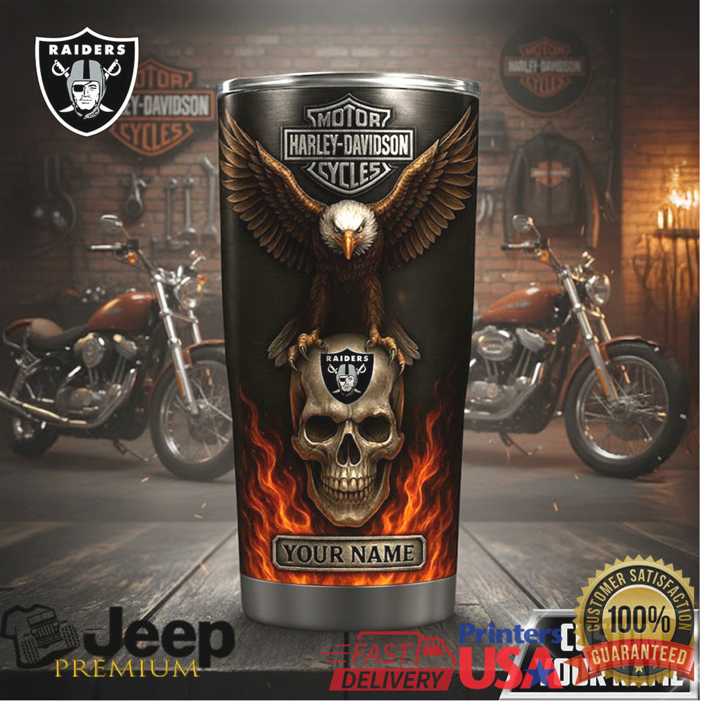()Custom Las Vegas Raiders & Harley Davidson Flame Skull Tumbler, Sport Tumbler and Funny Tumbler
