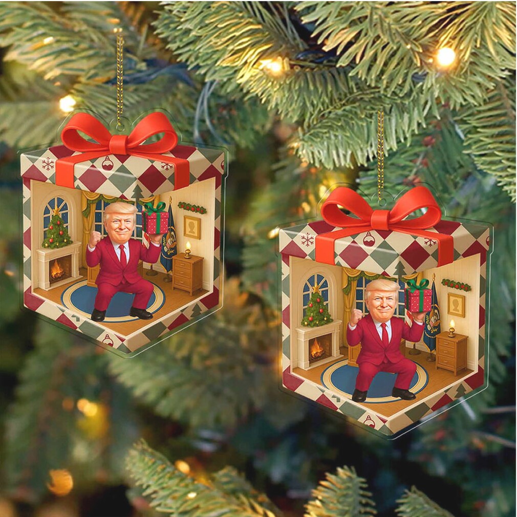 The Custom Trump Isometric Gift Box 2D Acrylic Ornament is ideal for passionate Trump supporters, collectors of political novelty items, and those who appreciate witty and patriotic Christmas decor. It’s an excellent gift for friends, family, or colleagues who share a similar political outlook and enjoy unique holiday items. Display it proudly on your Christmas tree, as a charming car hanging, or in a special display case. It’s a memorable way to infuse your holiday celebrations with personality and pride. As seen in the second image, this ornament is sure to become a beloved conversation piece.