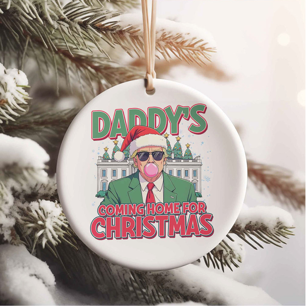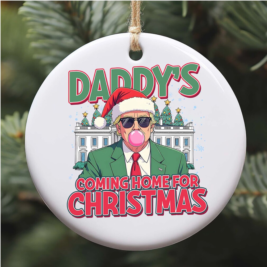 “Daddy’s Coming Home for Christmas!” Celebrate the holidays with a touch of political humor with this Funny Trump Christmas Ornament. Featuring the 47th President, this ceramic ornament is the perfect way to bring some MAGA cheer to your car or Christmas tree. A hilarious gift for any proud Trump supporter!