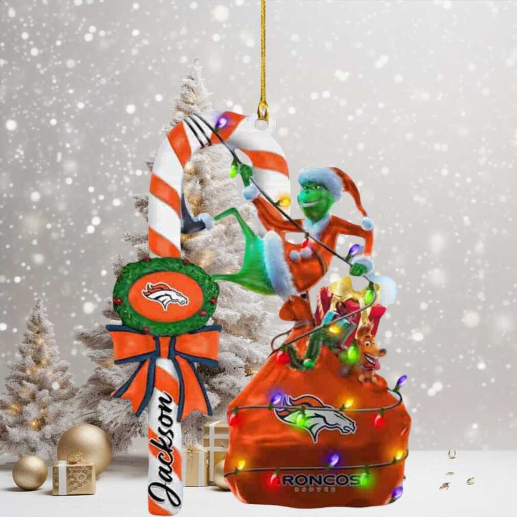 This isn’t your average Christmas ornament; it’s a symbol of your dedication to the Denver Broncos. The unique Grinch and candy cane design captures the fun of the holidays, while the custom name option makes it a truly special keepsake.