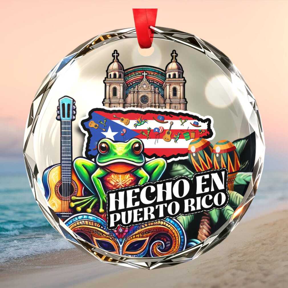 Vibrant and full of island spirit, this acrylic ornament features the green Coqui frog — a beloved symbol of Puerto Rico — alongside cultural heritage icons and the phrase ‘Hecho en Puerto Rico.’ A colorful and proud celebration of Boricua identity.