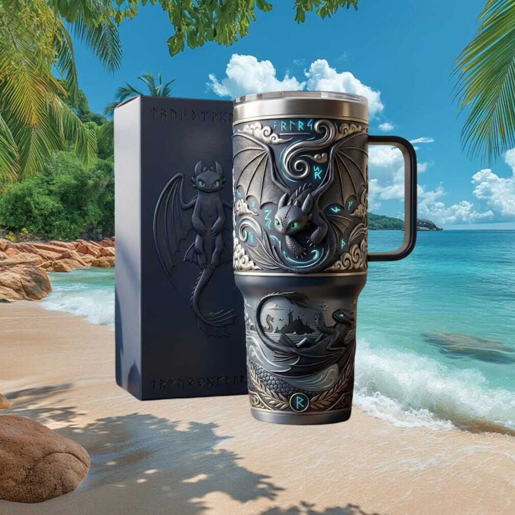 This is Toothless approved! This How to Train Your Dragon fan tumbler features the beloved Night Fury in stunning 3D embossed detail with Viking rune inscriptions and Berk-inspired Norse artwork. A treasure for every dragon trainer.