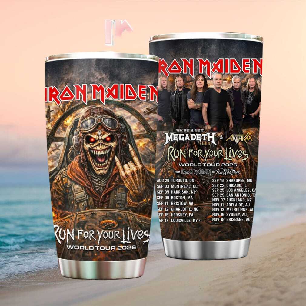 Up the irons! This Iron Maiden 2026 World Tour fighter pilot edition tumbler features Eddie in full aerial combat regalia with ‘Run for Your Lives’ tour branding. Premium 40oz insulated stainless steel for the heavy metal warrior who refuses to stay grounded.