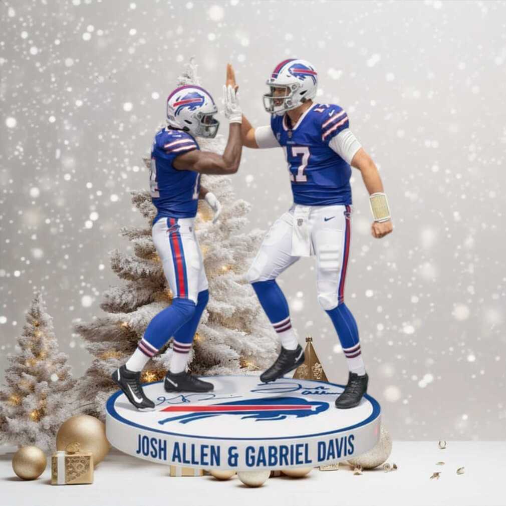 Celebrate the dynamic duo of Josh Allen and Gabriel Davis with this Buffalo Bills NFL ornament! A perfect addition to any Bills Backer’s Christmas tree, this ornament showcases two of the team’s most exciting players. A must-have for showing off your Buffalo Bills pride during the holiday season.