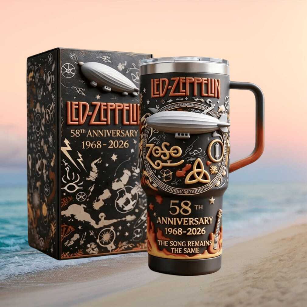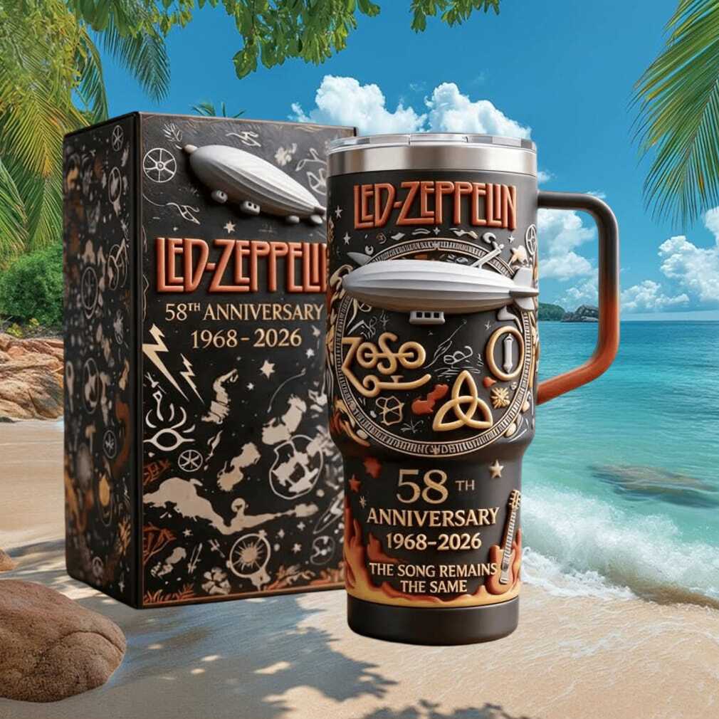 In the light — this 58th anniversary Led Zeppelin tumbler shines with the legendary Zoso symbols across its sleek black surface. Celebrating 1968–2026, this premium 40oz collector’s piece pays homage to rock’s greatest band with iconic iconography that any Zeppelin devotee will recognize immediately.
