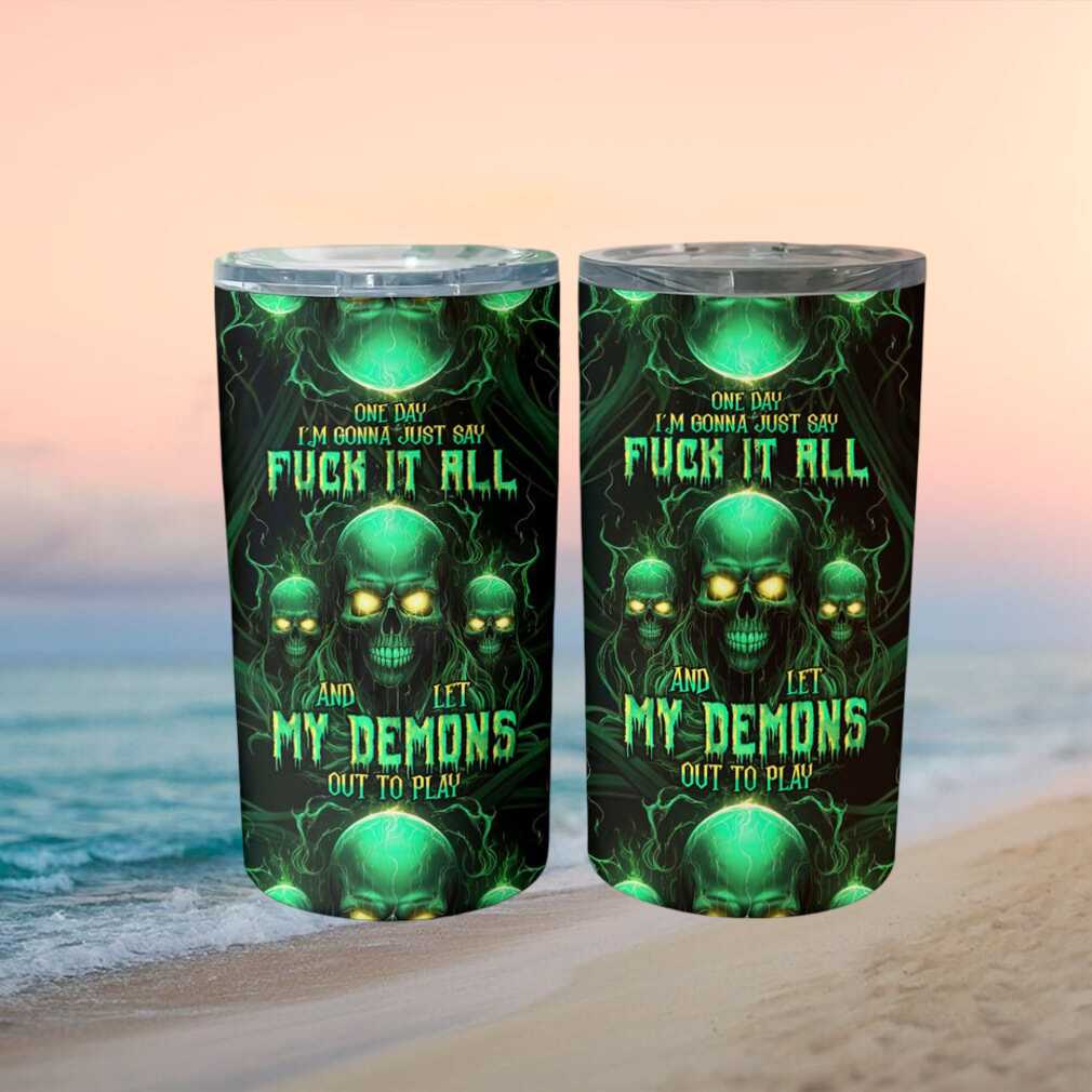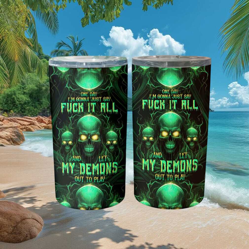 Embrace your dark aesthetic with this bold Let My Demons Out To Play Green Flaming Skulls Edgy Graphic tumbler. Featuring striking gothic artwork on a durable stainless steel body, this statement piece keeps your drinks at the perfect temperature all day long.