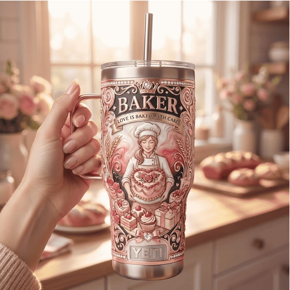(“Love is Baked with Care” Pastry Chef Baker Pink 3D Tumbler)“Love is Baked with Care” Pastry Chef Baker Pink 3D Tumbler, Treat yourself or make a great gift for your loved ones