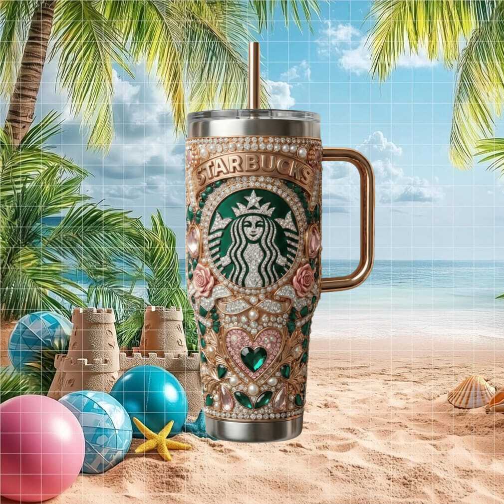 (Luxury Starbucks Inspired Emerald & Gold Rhinestone Tumbler Bejeweled Floral Coffee Tumbler)Luxury Starbucks Inspired Emerald & Gold Rhinestone Tumbler Bejeweled Floral Coffee Tumbler, Treat yourself or make a great gift for your loved ones