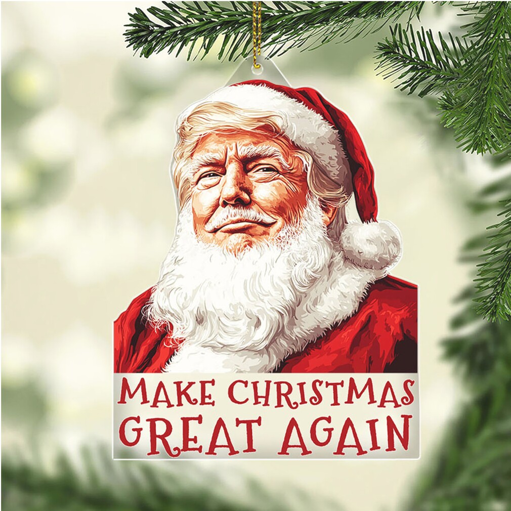 The Make Christmas Great Again Ornament is crafted from durable acrylic, designed to last through many holiday seasons without losing its charm. Its clear, vibrant print ensures the iconic message stands out, making it an ideal Christmas tree Trump decoration or a car hanging Trump ornament. The lightweight material makes it easy to display anywhere you choose, adding a touch of personalized flair. This ornament truly shines by offering a unique way to combine festive cheer with a clear expression of your political enthusiasm. It’s a statement piece that’s built to endure, reflecting your pride year after year.