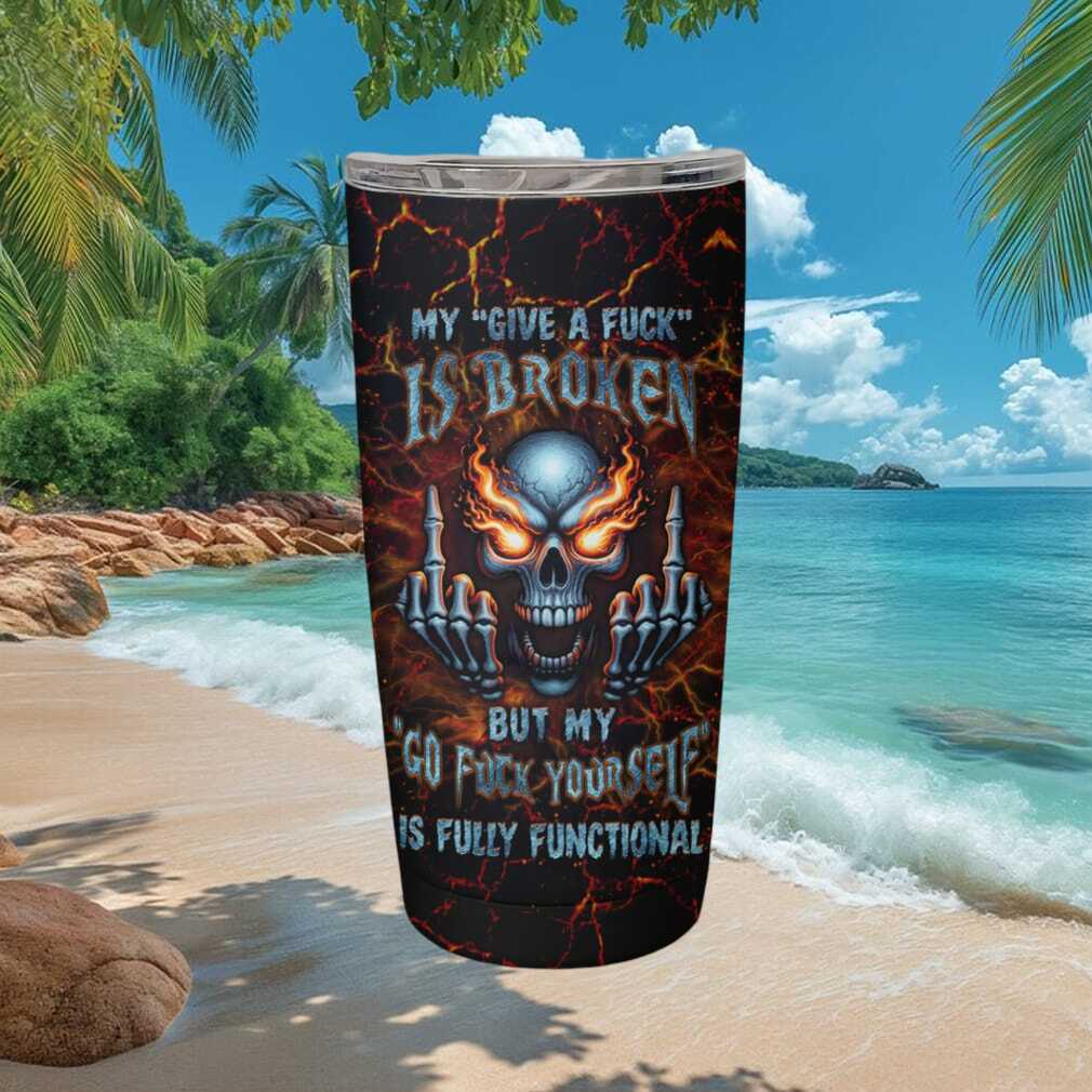 🥤 About My Give A Fuck Is Broken Flaming Blue Skull Fire and Ice Sarcastic Tumbler
