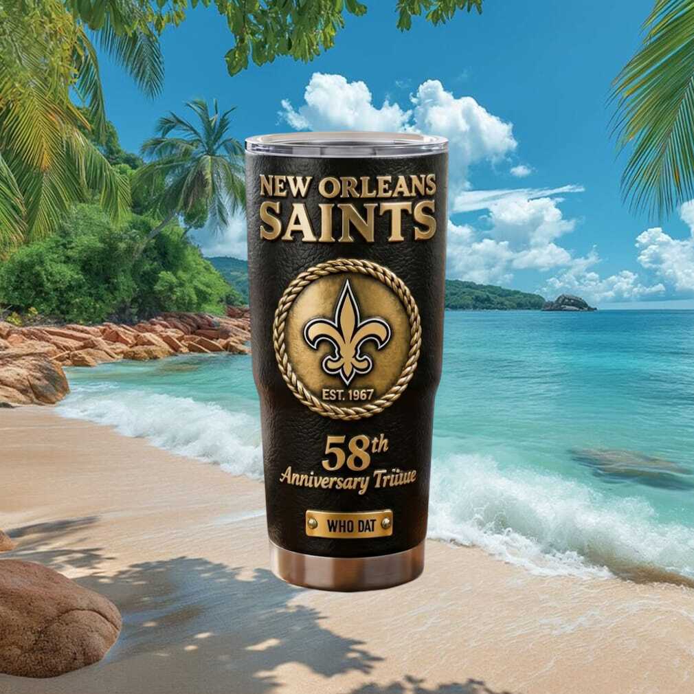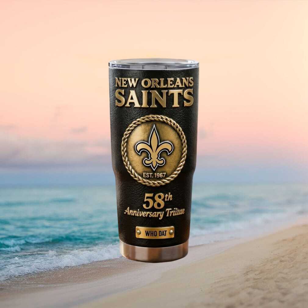 Who Dat! Celebrate 58 years of New Orleans Saints football with this embossed leather-style anniversary tumbler. Rich texture and bold Saints graphics on premium double-wall insulated stainless steel make this the ultimate fan collectible since 1967.