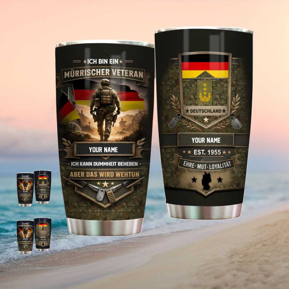 Ein Veteran mit Charakter! This personalized German veteran tumbler features the Deutschland flag, military-inspired design, and grumpy veteran humor with custom name. A warm salute to former German service members who earned the right to be a little grumpy.