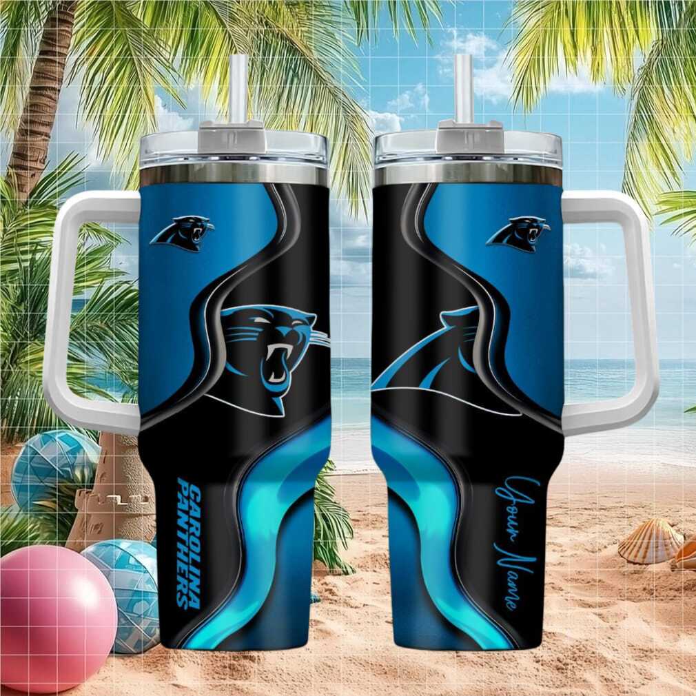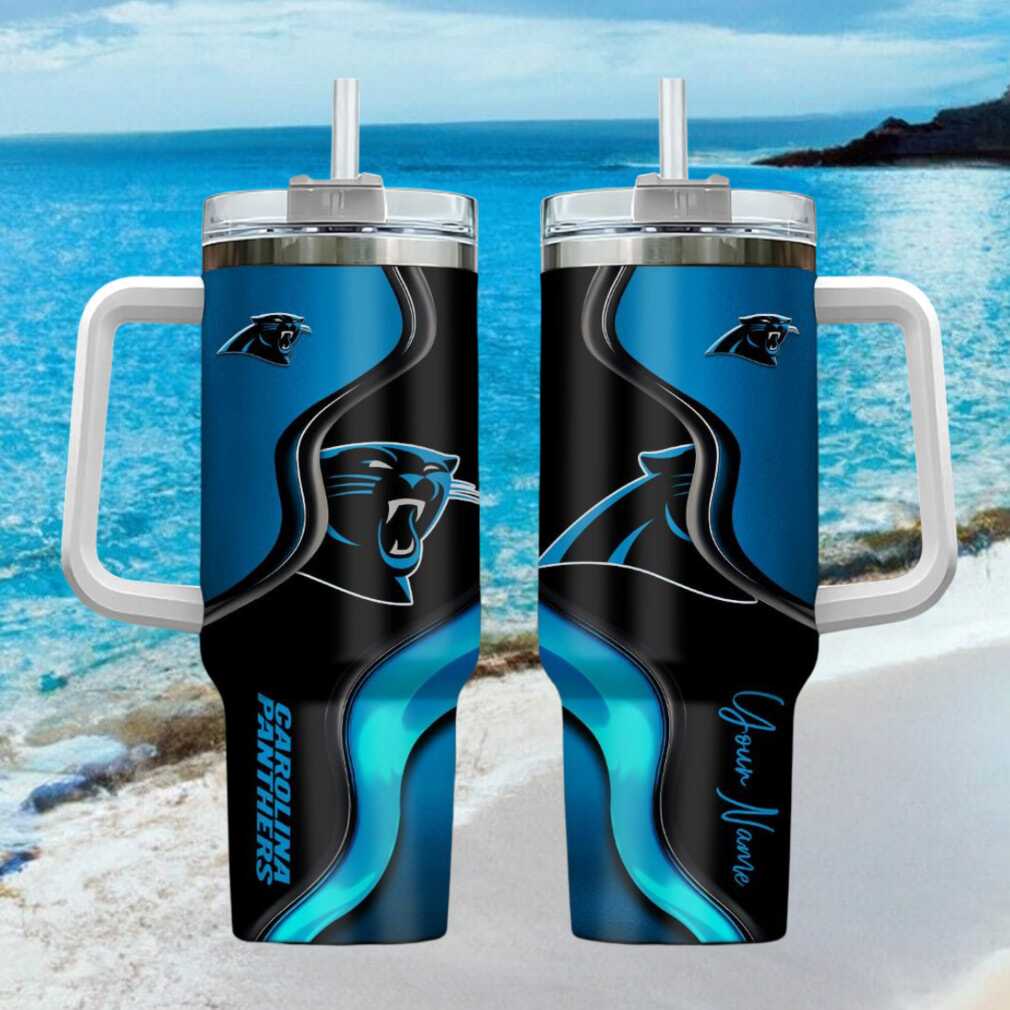(Personalized Carolina Panthers Blue & Black Logo Travel Tumbler with Handle)Personalized Carolina Panthers Blue & Black Logo Travel Tumbler with Handle, Treat yourself or make a great gift for your loved ones