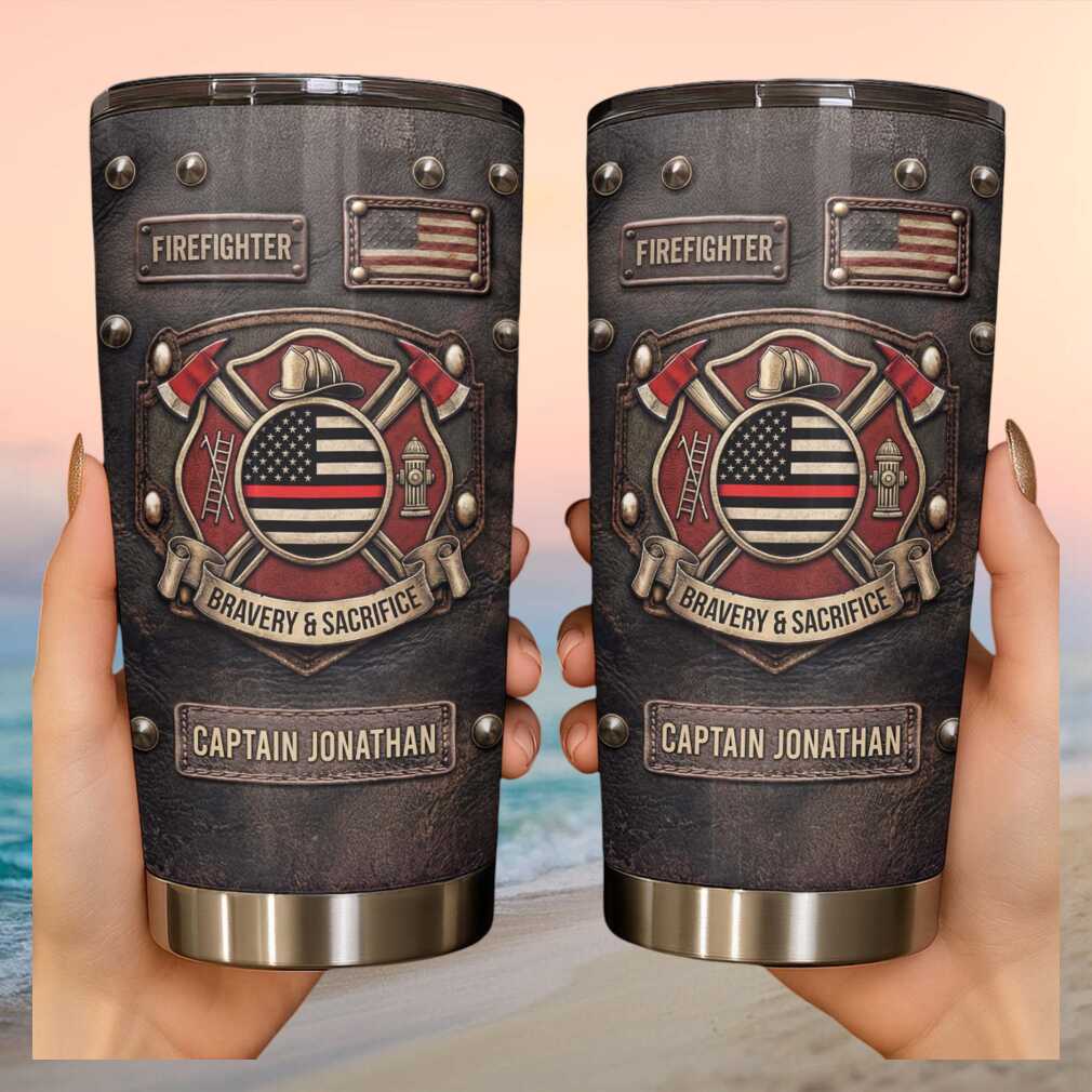 Honor the bravest with this custom firefighter captain leather-look tumbler. Personalized with name and rank, featuring firefighting emblems and bold ‘Bravery & Sacrifice’ messaging. A powerful 40oz tribute to the heroes who run toward danger. Makes a proud gift for any fire department captain.