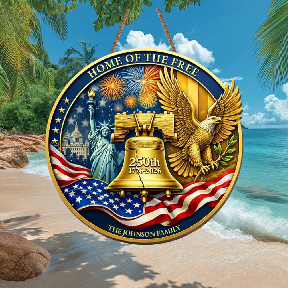 Hang this inspiring personalized wall plaque ornament featuring the Liberty Bell and the phrase ‘Home of the Free’ to commemorate America’s 250th anniversary. A perfect patriotic accent piece that can be customized with a family name or personal message.