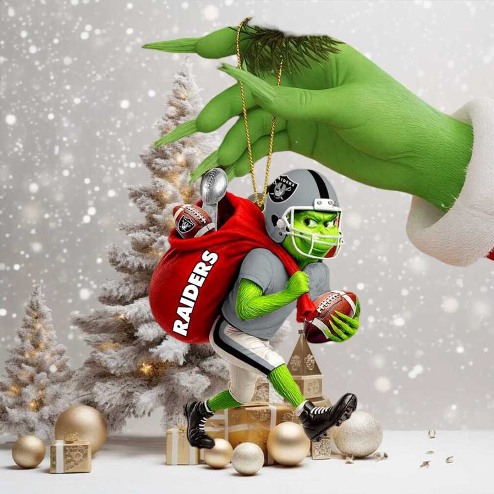 Raider Nation meets Whoville this Christmas! This personalized Las Vegas Raiders Grinch Christmas ornament is the ultimate mashup for football fanatics with a soft spot for the Grinch. It’s more than just a decoration; it’s a bold statement of team loyalty and holiday cheer, perfect for anyone who bleeds silver and black.