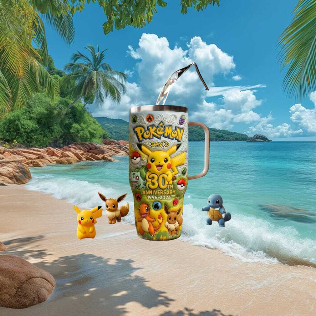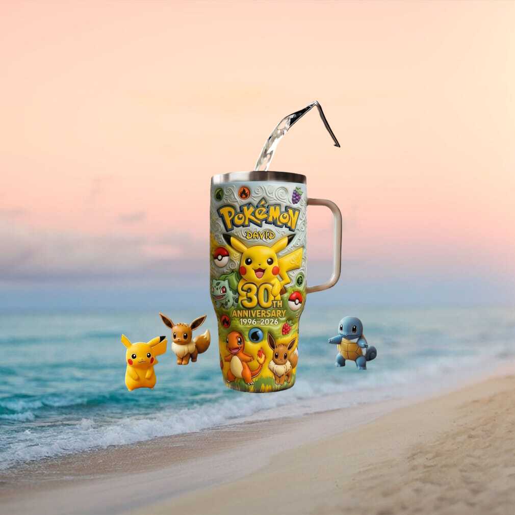 Celebrate 30 years of Pokémon with this personalized Pikachu anniversary tumbler spanning 1996–2026. Feature your name alongside everyone’s favorite electric mouse in commemorative anniversary artwork. Premium 40oz double-wall insulated stainless steel keeps drinks at the perfect temperature. The ultimate gift for Pokémon trainers of all generations.