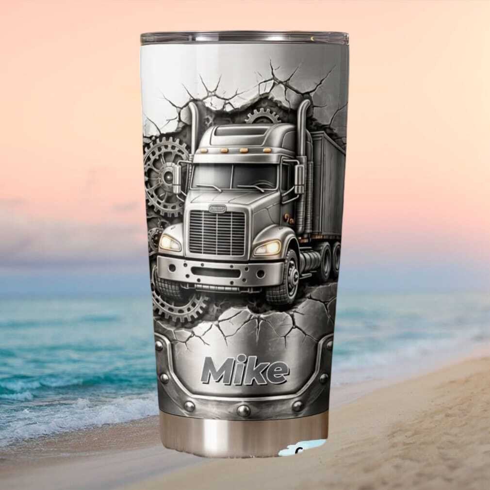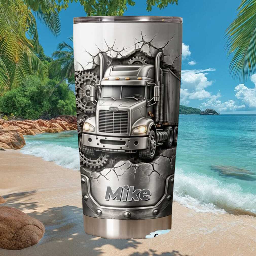 Built for the open road — this 20oz personalized tumbler features a rugged metal gear and semi-truck design perfect for the hardworking driver in your life. Custom name option, durable double-wall stainless steel, and a compact size that fits in any cup holder. Mile after mile of great coffee.