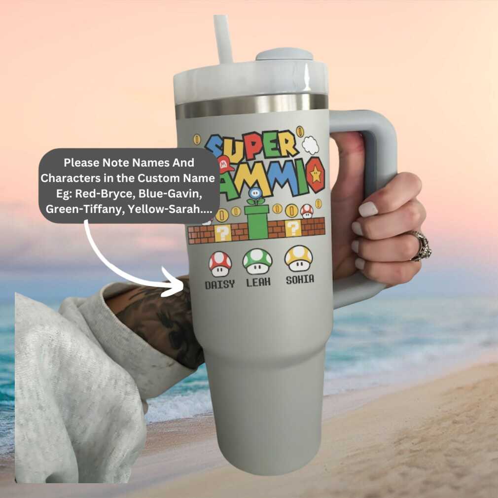 (Personalized Super Mammi Retro Video Game Style Mom 40oz Tumbler with Handle)Personalized Super Mammi Retro Video Game Style Mom 40oz Tumbler with Handle, Treat yourself or make a great gift for your loved ones
