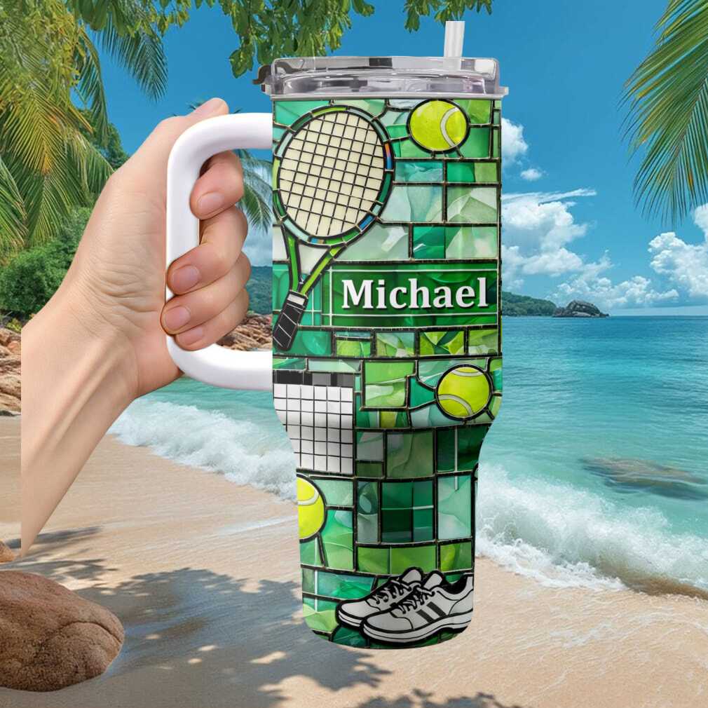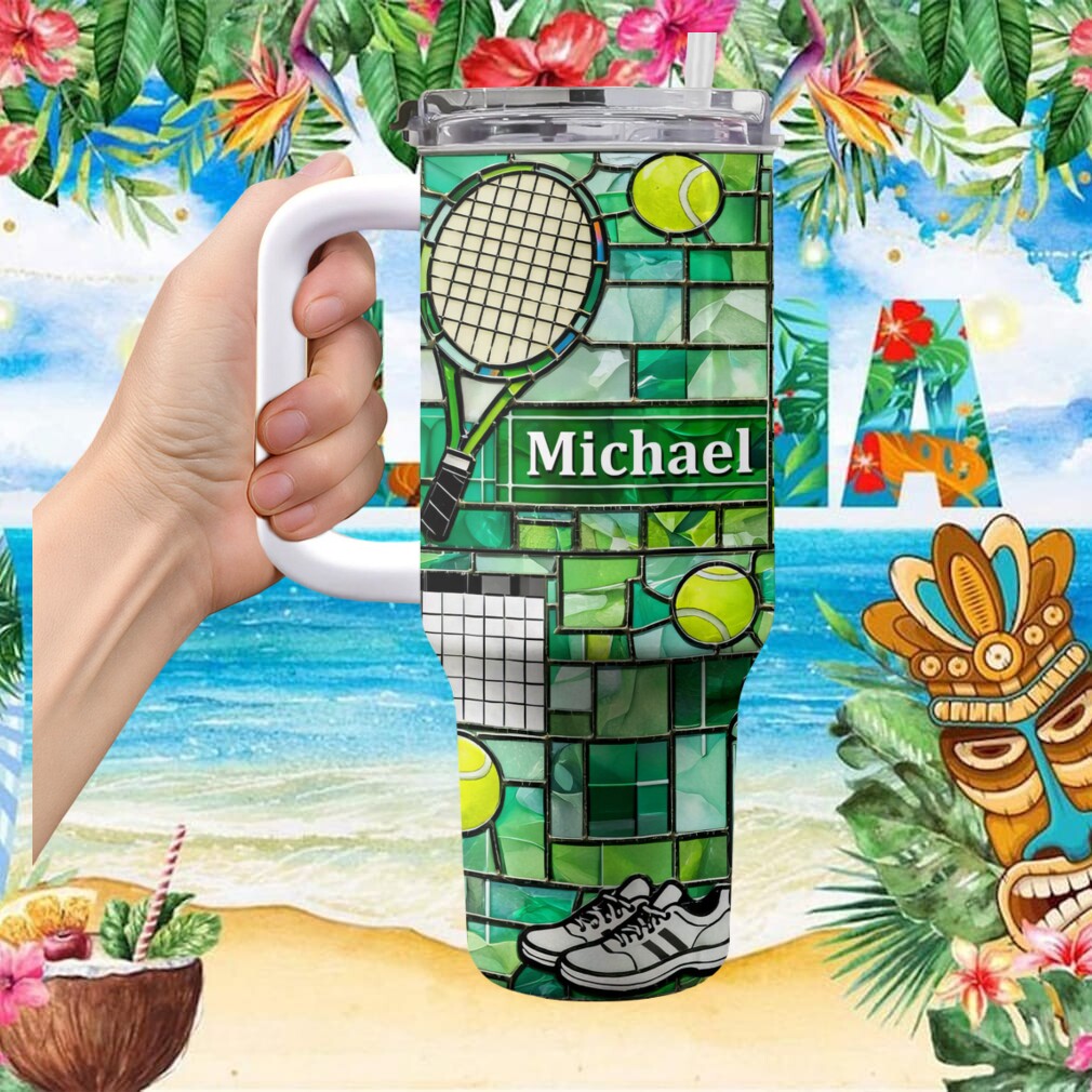 (Personalized Tennis Player Stained Glass Design 40oz Tumbler with Handle)Personalized Tennis Player Stained Glass Design 40oz Tumbler with Handle, Treat yourself or make a great gift for your loved ones