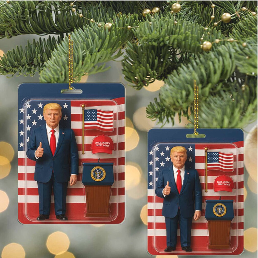 This isn’t just any ornament; it’s a bold expression of American spirit featuring President Trump giving a classic thumbs up. Imagine the smiles and nods of approval as this ornament hangs in your car, adding personality to your daily drive, or twinkling among the lights on your Christmas tree. Made from durable acrylic, this President Trump Thumbs Up 2D Acrylic Ornament is built to last, year after year. Its vibrant design captures attention, making it a standout piece whether it’s a rearview mirror accessory or a festive holiday highlight. Lightweight and easy to hang, it fits seamlessly into any decor, bringing a touch of presidential flair wherever it goes.