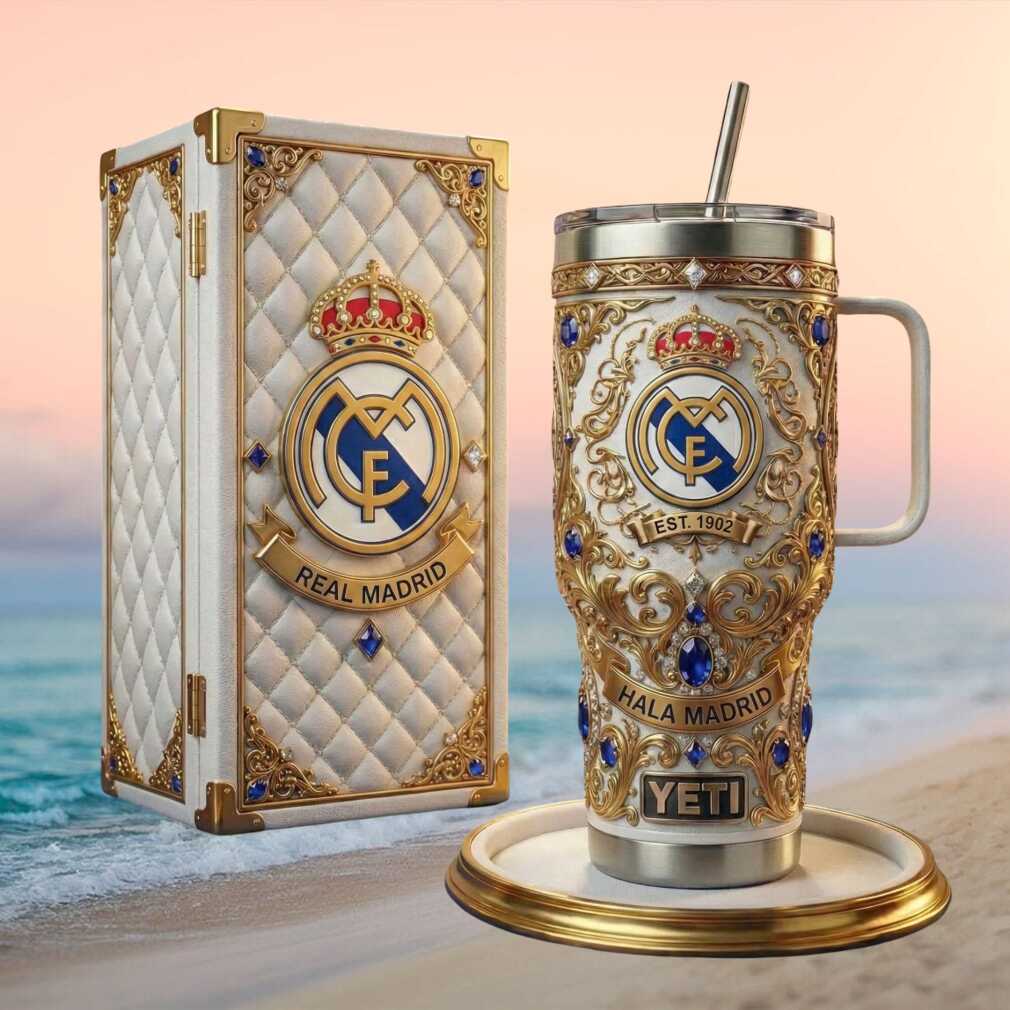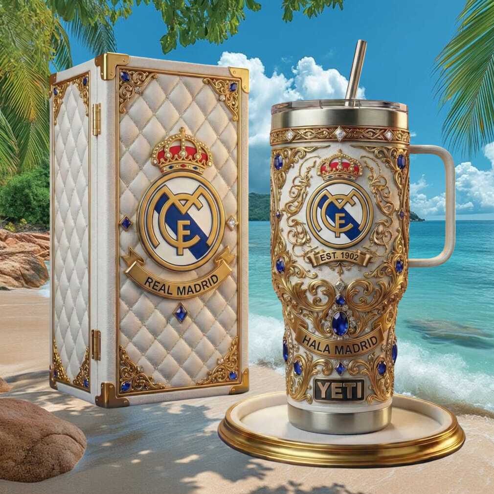 Hala Madrid! Celebrate Real Madrid’s legendary legacy with this white and gold luxury anniversary tumbler. Honoring the club’s storied history since 1902, this premium 40oz stainless steel tumbler features elegant club crest design. Double-wall insulation keeps drinks at the perfect temperature. The ultimate gift for Madridistas worldwide.