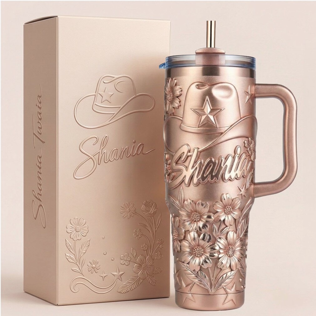 (Shania Twain Cowboy Hat & Flowers Rose Gold 3D Tumbler Wrap)Shania Twain Cowboy Hat & Flowers Rose Gold 3D Tumbler Wrap, Treat yourself or make a great gift for your loved ones