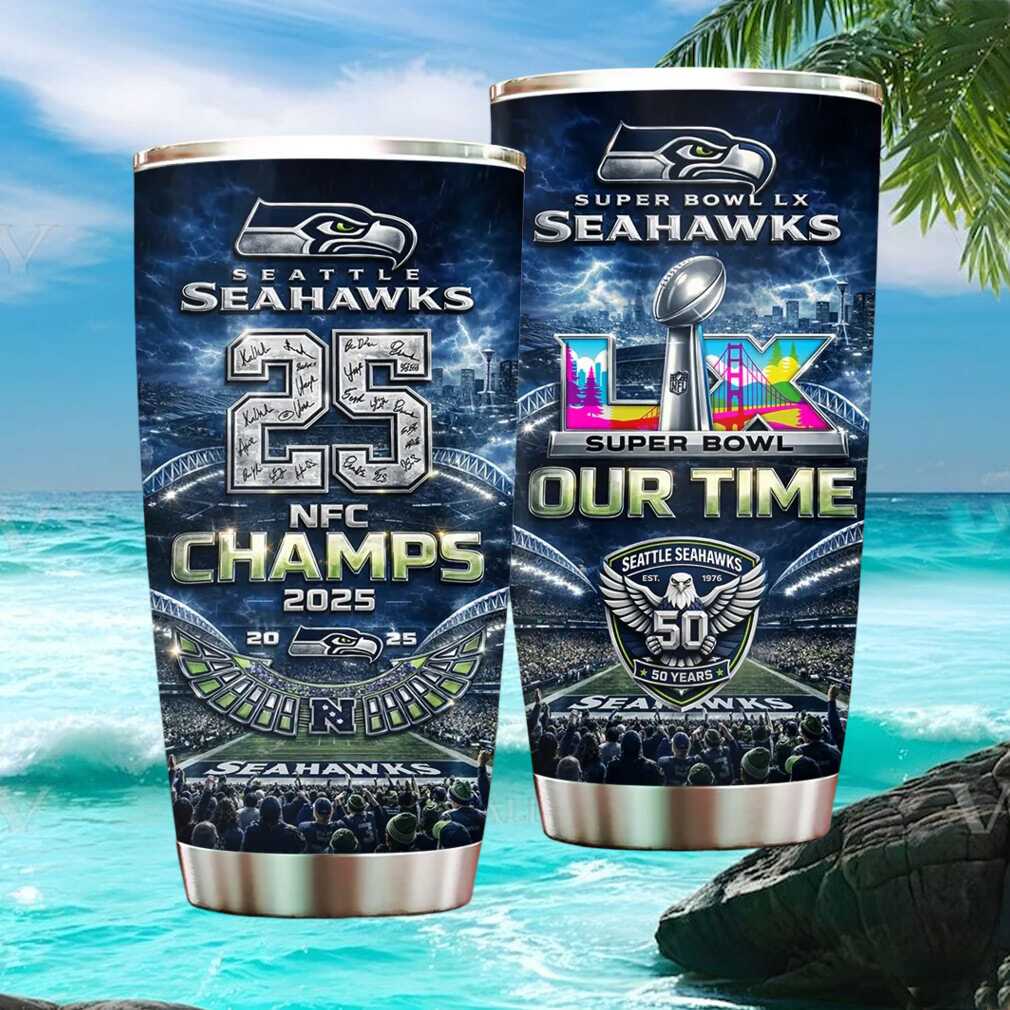 (Super Bowl LX Seattle Seahawks 2025 NFC Champs “Our Time” Tribute Tumbler)Super Bowl LX Seattle Seahawks 2025 NFC Champs “Our Time” Tribute Tumbler, Treat yourself or make a great gift for your loved ones